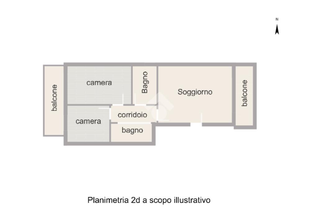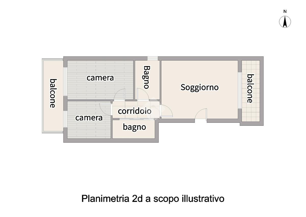 L’immobile si sviluppa su un unico livello e presenta una distribuzione funzionale degli spazi interni. L’ingresso conduce alla zona giorno composta da soggiorno e cucina abitabile, entrambi con accesso diretto al balcone. Un disimpegno separa la zona notte, dove sono presenti una camera matrimoniale, una camera singola e due servizi. Le camere affacciano su un secondo balcone.