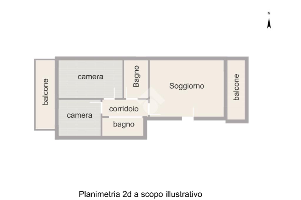 L’immobile si sviluppa su un unico livello e presenta una distribuzione funzionale degli spazi interni. L’ingresso conduce alla zona giorno composta da soggiorno e cucina abitabile, entrambi con accesso diretto al balcone. Un disimpegno separa la zona notte, dove sono presenti una camera matrimoniale, una camera singola e due servizi. Le camere affacciano su un secondo balcone.