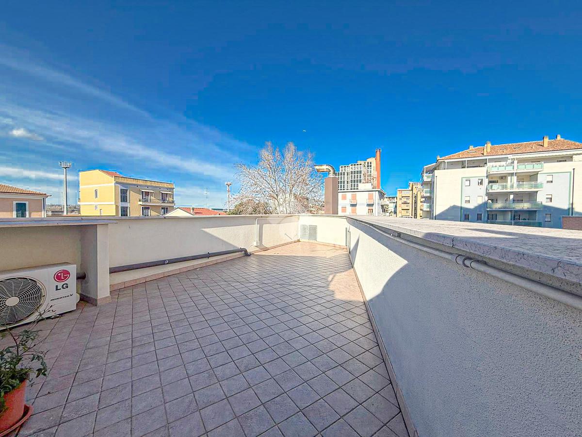 Una scala interna conduce al piano superiore, dove si trovano un comodo locale lavanderia e un magnifico terrazzo panoramico. Affacciato su Piazzale Agorà, questo spazio esterno rappresenta una vera oasi privata: il luogo ideale per rilassarsi, leggere un libro o organizzare piacevoli serate all'aperto.
