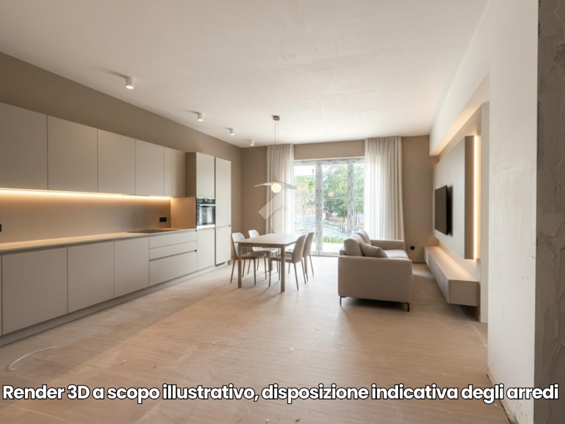 Piano Terra Soluzione 1: soggiorno con angolo cottura, disimpegno, due camere da letto e doppi servizi. Completa la proprietà un giardino privato e posto auto assegnato.
